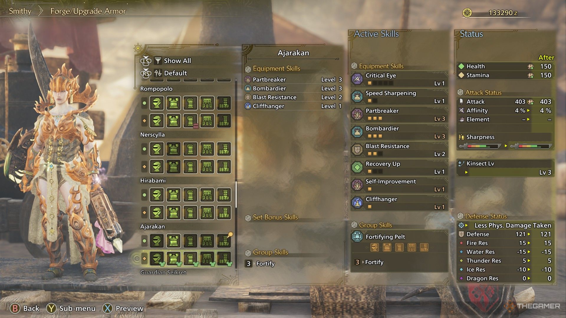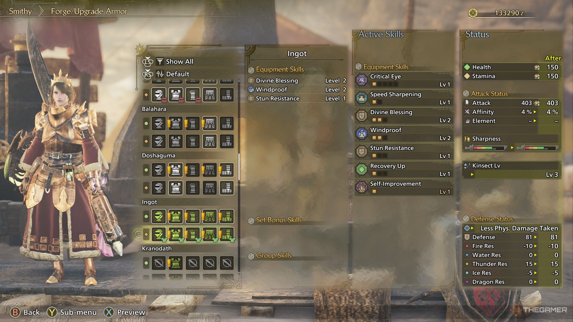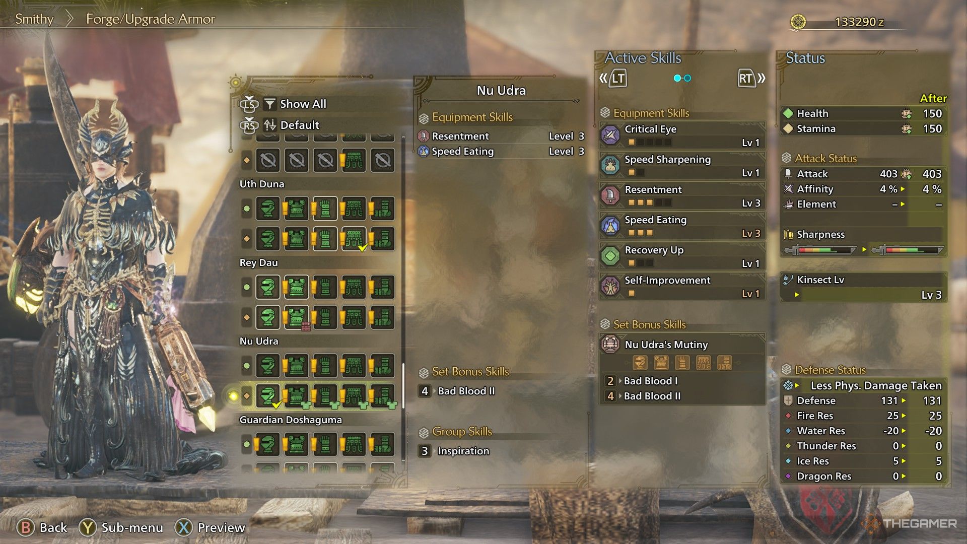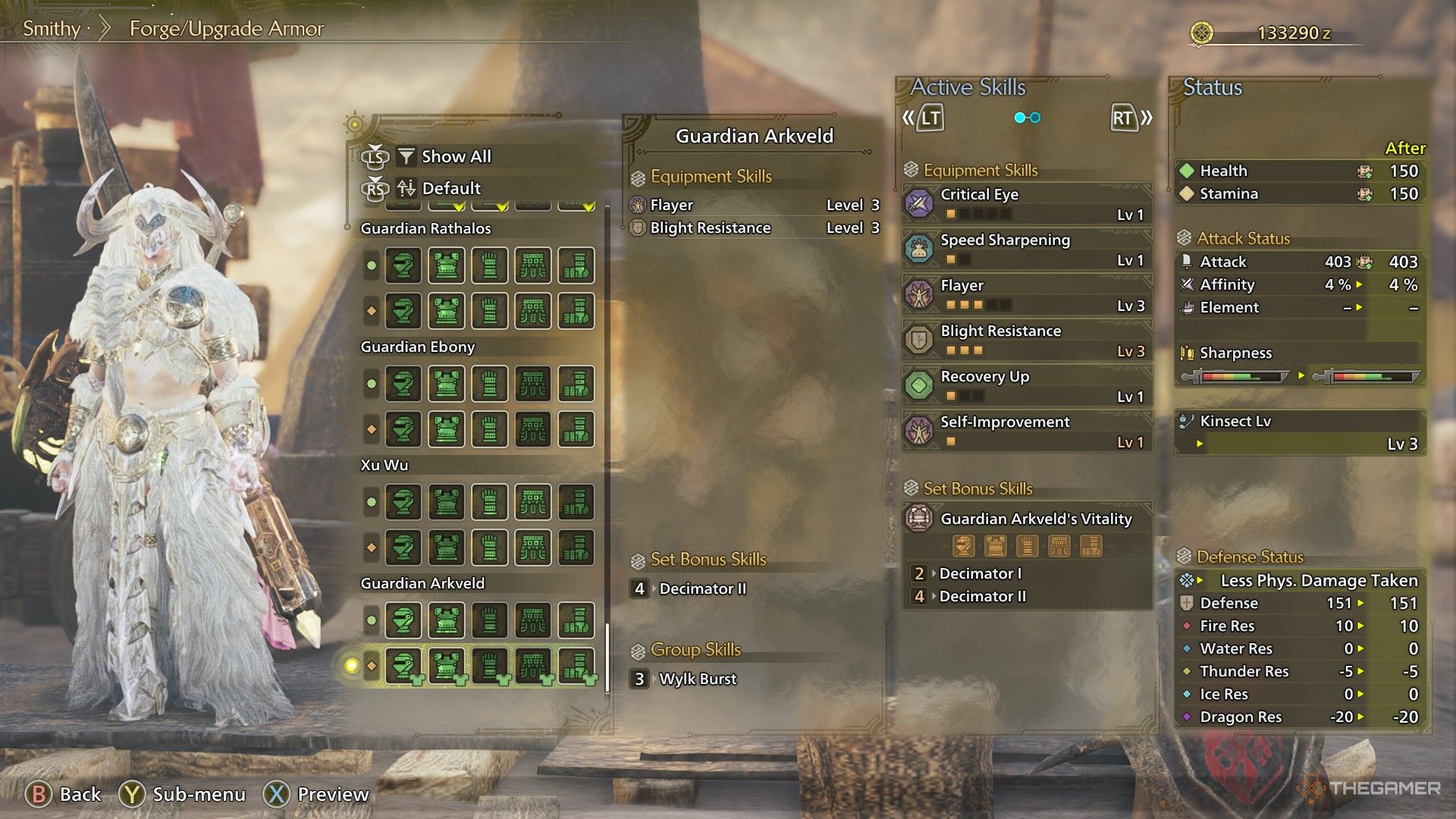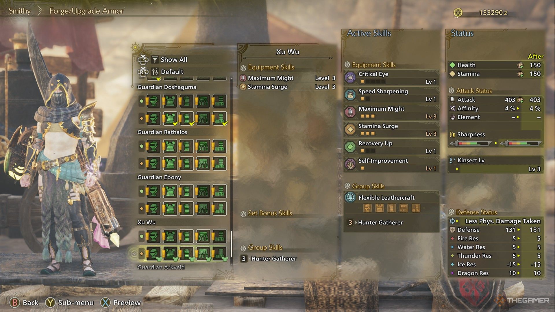 這兩種技能相結合,使徐武盔甲對於低等級的最終 Boss 非常有用,特別是如果你不太依賴耐力的話。全套還為您提供獵人採集技能,當您收集高等級的製作材料時,該技能將非常有用。