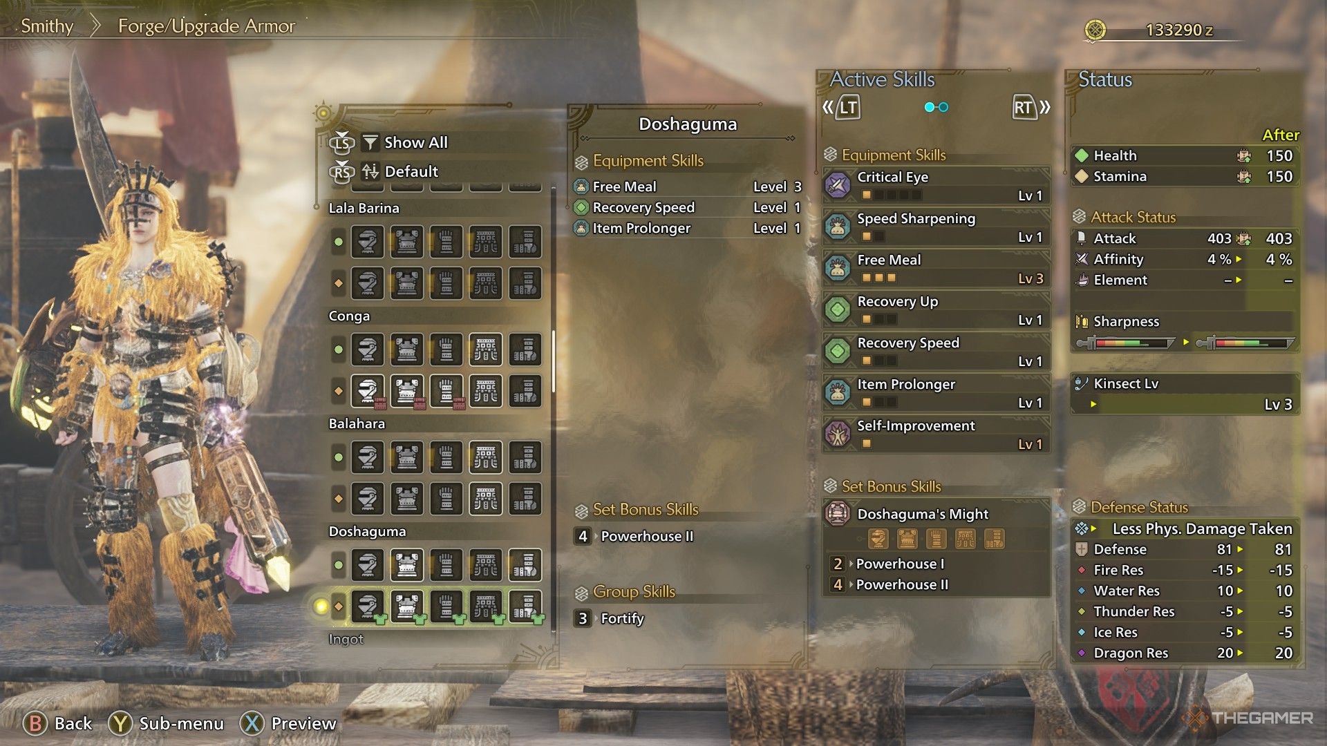 Doshaguma 盔甲是完成盔甲套裝的重要性真正發揮作用的地方。它不僅可以提高盔甲的技能,還可以讓你獲得團體技能的好處。當您擁有一定數量的同一組盔甲時,即可獲得團體技能。