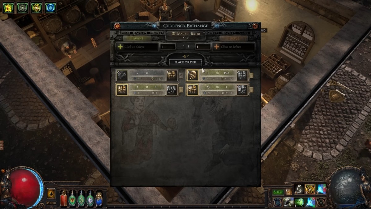 任何選項卡上的每次更改都會改變市場比率,因此如果您儲備了一堆不同的貨幣,您可以更改每種貨幣的當前匯率以找到最佳交易。最受歡迎的貨幣將列在貨幣兌換市場的頂部,因此如果您想要快速交易,您應該使用這些貨幣進行交易。通常,這些是混沌球和神聖球,但看看這些交易如何自動化,其他貨幣的交易量可能會增加。