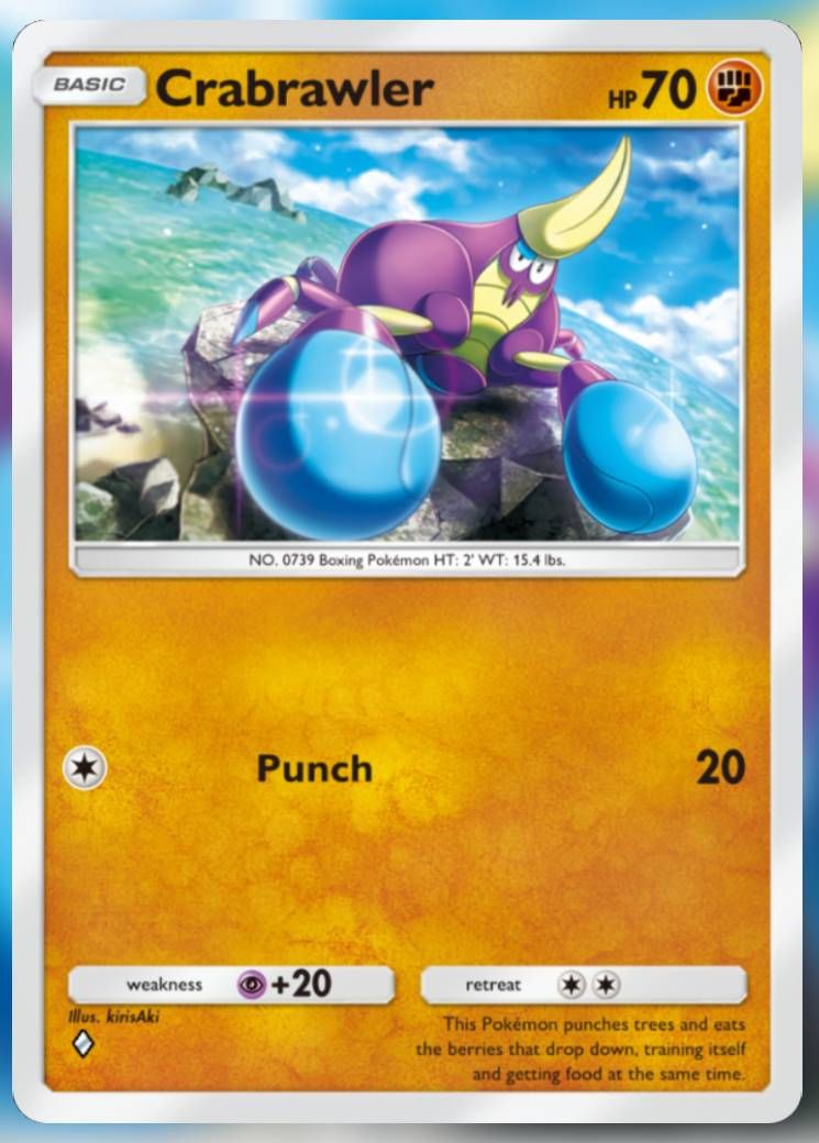 螃蟹是一種基礎格鬥型神奇寶貝1 個能量造成 20 點傷害,但可以進化成水系蟹蟲前身,同一個能量可以造成 40 或 80 點傷害。這對於需要一些時間來設置的套牌來說是一個嚴重的威脅!