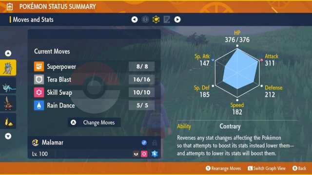 隨著斯克勒迪爾吉的無意識能力消失,馬拉馬爾可以自由地與超能力設置直到其攻擊力達到最大。為了提高你的傷害輸出,使用雨舞和Terastallize 為水 Tera 類型。從那裡,您可以繼續發送垃圾郵件 Tera Blast.