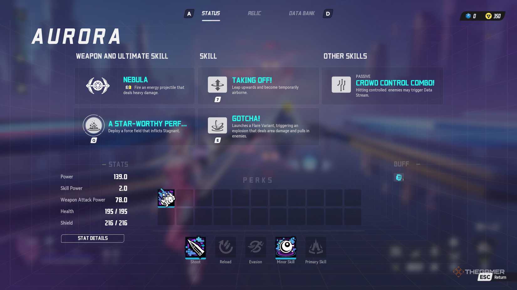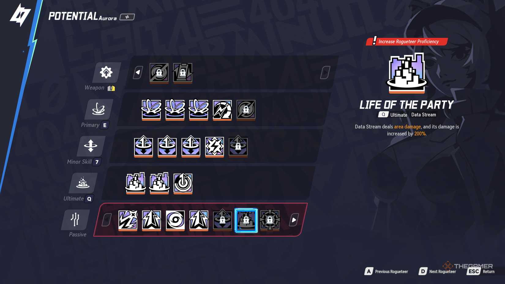 她的主要技能“Gotcha”會發射將敵人聚集在一起的漩渦彈丸,非常適合圍攻和設置 AoE 組合。她的第二技能可以讓她飛行並潛回強大的 AOE 猛擊。與她的被動搭配,可提供百分之二十有機會觸發數據流對受控制的敵人,以及靈活的命中掃描閃電武器可以通過 Aurora 帶來的福利來增強強大的人群控制、機動性以及對任何建築的持續損壞。
