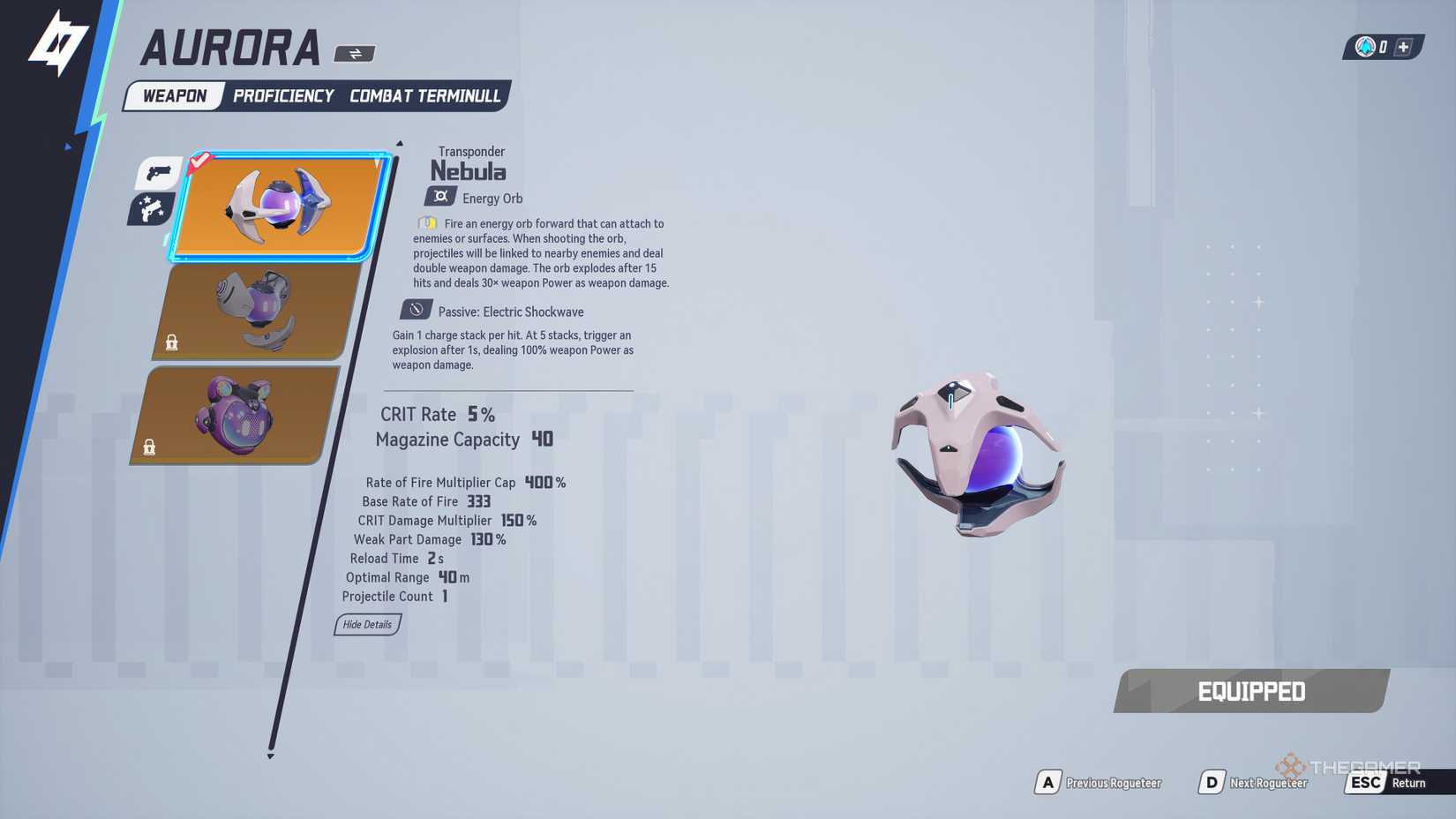 奧羅拉最好的武器整體是星雲,由於它與她的套件及其的強大協同作用有效處理小怪和老闆的能力。能量球會粘在敵人或表面上,並鏈接到附近的目標雙重傷害,最終爆發出大爆發。