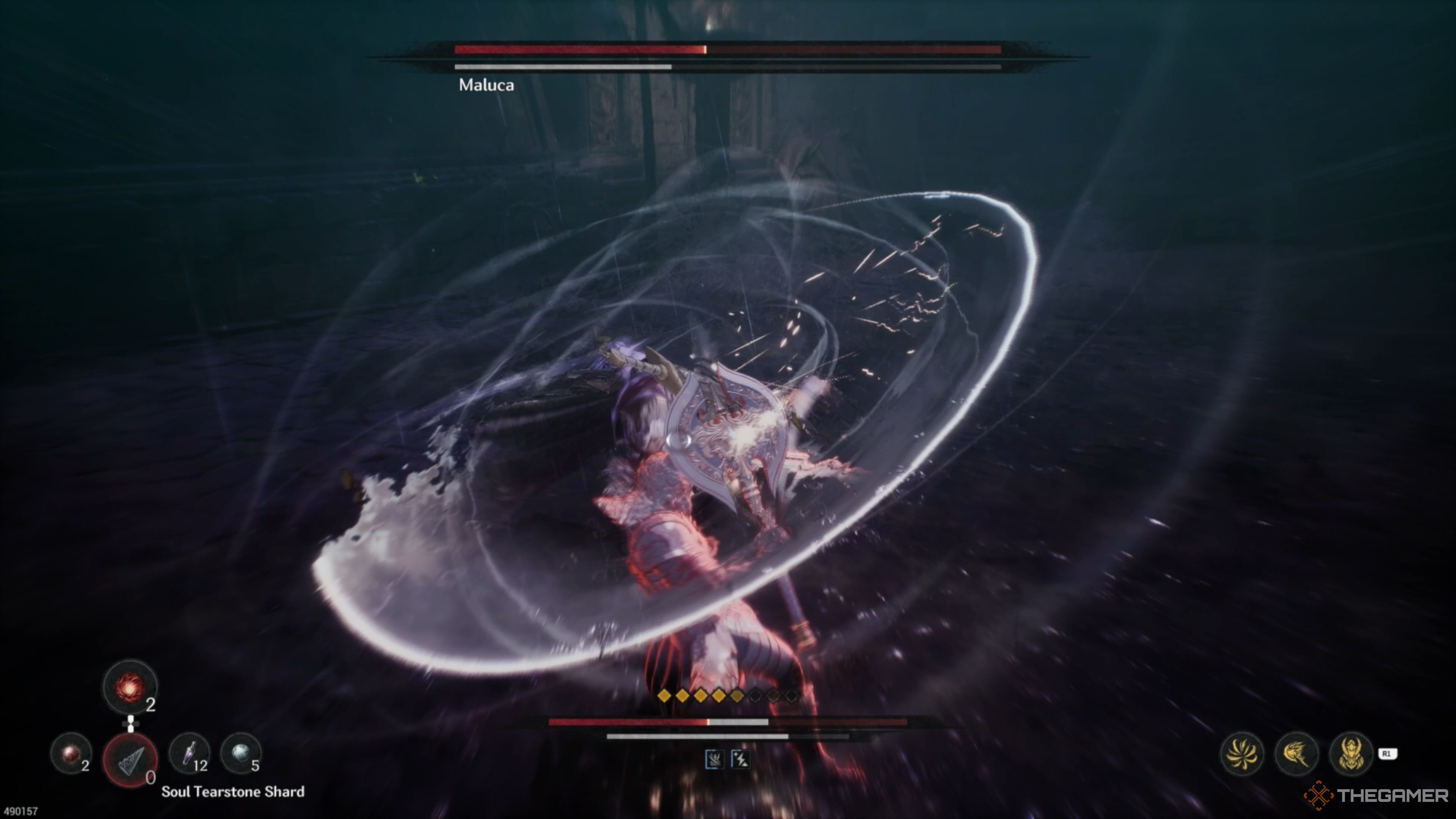 正如他開始向你旋轉,當他開始放下劍時就保持警惕對你反映它。然後,等待頭頂斬擊並在刀鋒擊中前進行防禦你。將會有一個小延遲,那麼馬盧卡將會進行一次小型的跳躍式過頂斬擊,在落地前進行防守另一個 Reflect,讓您能夠獲得一些點擊你自己的!