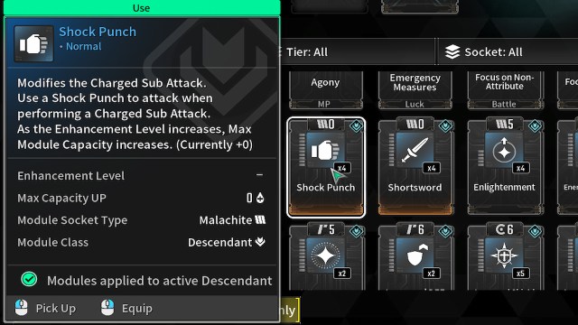 | 衝擊沖床(子模塊) | 進行帶電子攻擊時使用衝擊拳。隨著等級的提高,最大模塊容量也會增加。 |