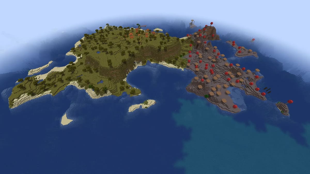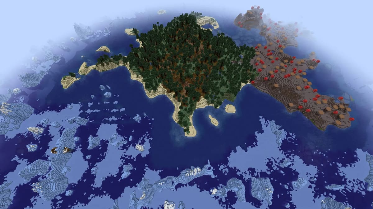 在這裡,您將在最不尋常的條件下生成。首先,出生時有一個巨大的生存島,由兩個生物群落組成:針葉林島和蘑菇島。其次,整個島嶼被一個巨大的冰山環包圍,這些冰山都是相連的。最後,地表有一艘沉船,卡在坐標 -150、-450 的一座冰山中。