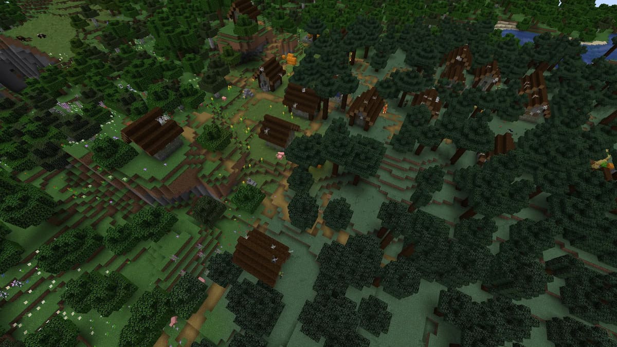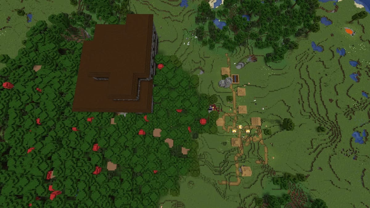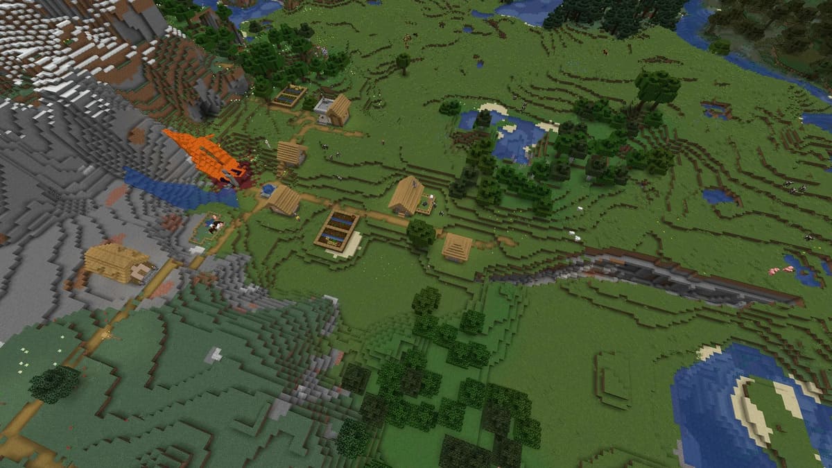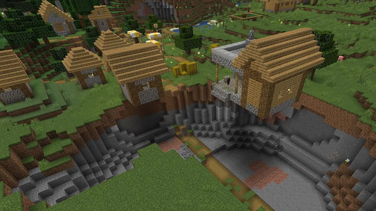 出生點附近有幾個村莊,坐標 -300、-350 處有一個被毀壞的傳送門。其中一個村莊發生了某種事故,導致鐵匠在地洞上方生成。這個不尋常的景象可以在坐標 50、-150 處找到。但村里的其他地方看起來很正常。