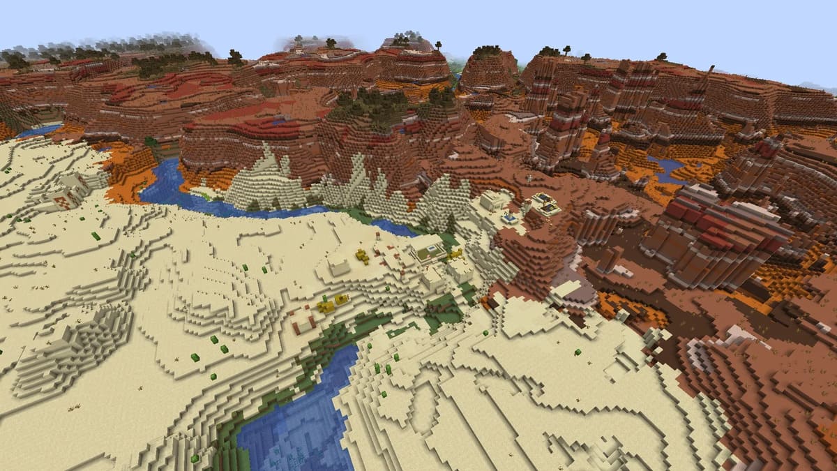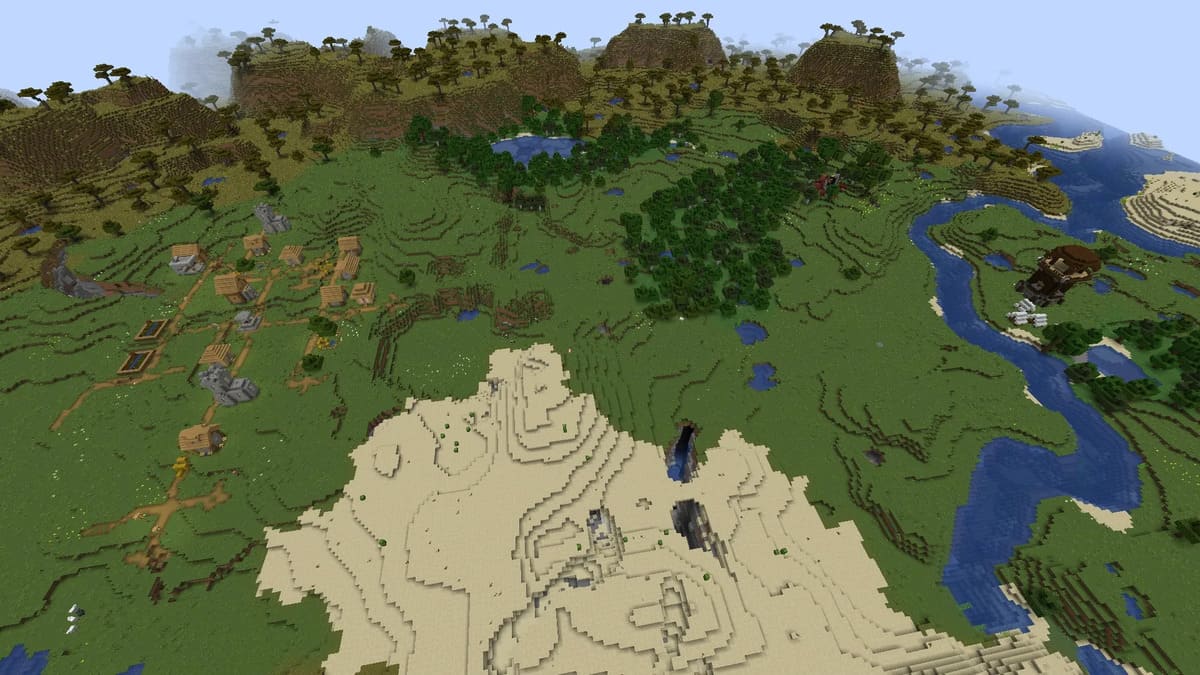 你將在海岸上生成,那裡有一個小村莊,毗鄰一些令人印象深刻的破碎稀樹草原生物群落。在坐標 50、200 處,您會在沙漠沙丘中看到一個暴露的廢棄傳送門,再往上,在坐標 50、50 處還有一座完全掩埋的沙漠神廟。如果您進入傳送門,那麼您可以在坐標 -150、150 和 100、-300 附近找到堡壘和堡壘遺跡。