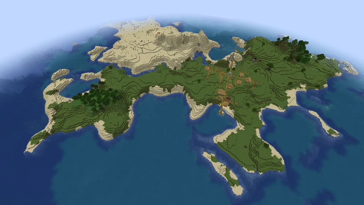 生成在一個巨大的生存島上,島上有村莊和兩個生物群落:平原和沙漠。在坐標-200、200處,您可以找到一座海洋紀念碑,旁邊有一艘沉船。在沉船下方,您可以挖掘位於精確坐標-199, 137 處的埋藏寶藏。