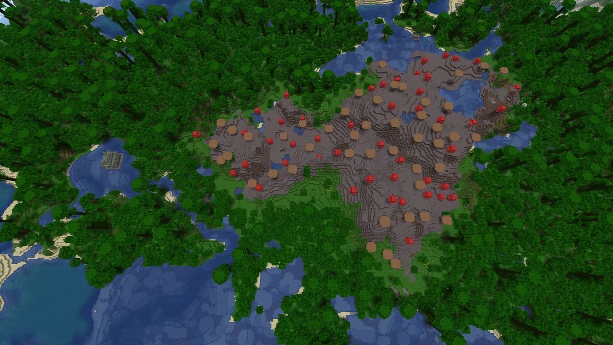 生成在叢林生物群落中,該生物群落的邊界內有極其罕見的內陸蘑菇生物群落。在蘑菇區的西邊,你會在坐標 250、-450 的小湖中找到一座叢林神廟。如果你向南旅行,你很快就會在坐標-150、200處找到一座沙漠神廟,裡面有一些不錯的戰利品。