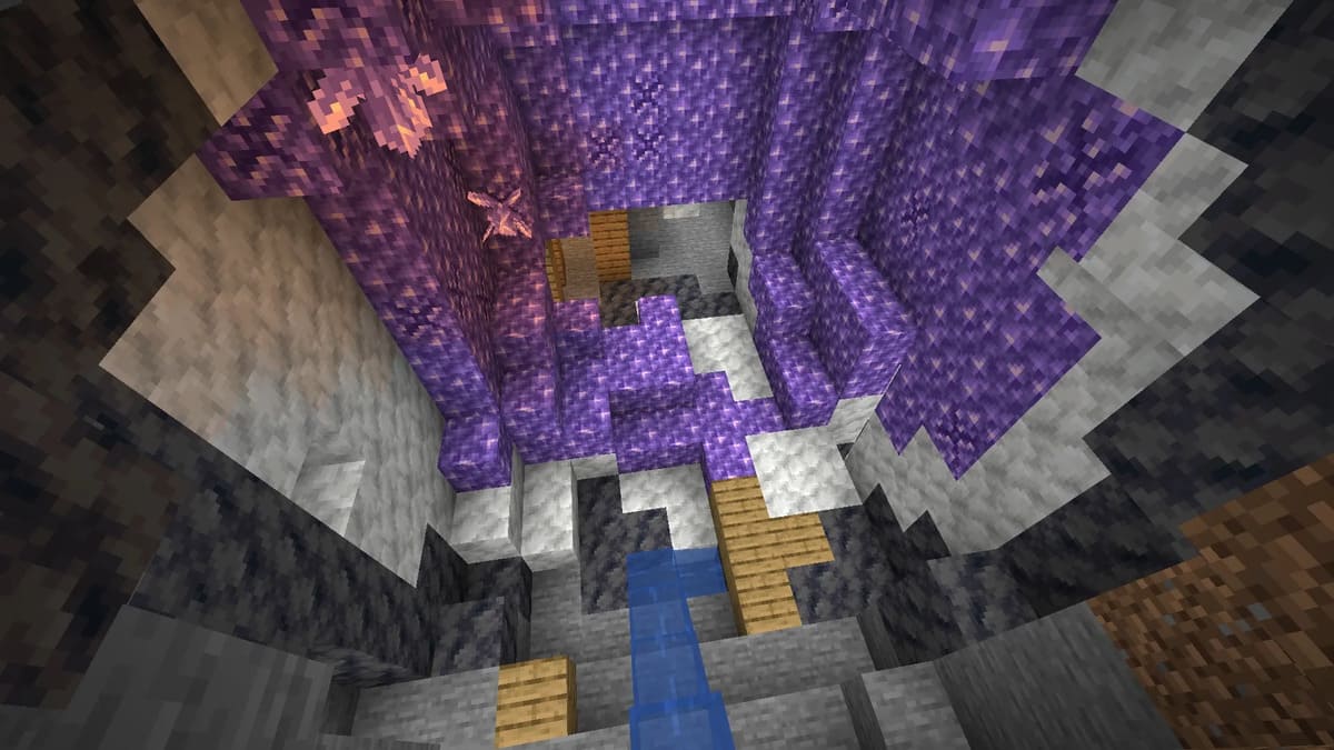 這個礦井很大,它經常連接並穿過多個紫水晶晶洞,你可以利用這些紫水晶晶洞來獲取所有那些漂亮的紫色方塊。