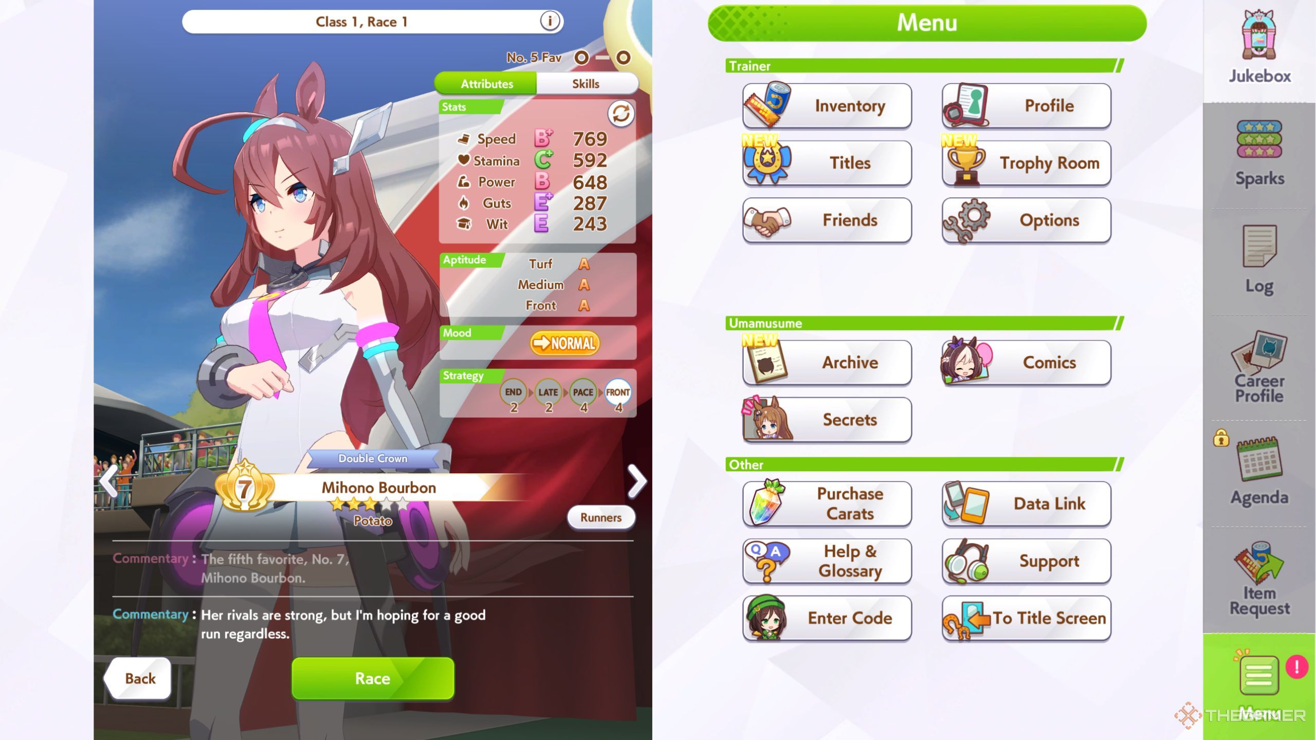 經典的 | 從第二年開始,你的注意力將主要轉移到贏得下一場比賽上。如上所述,Mihono 在她的職業生涯中很好地融合了三種比賽類型,並且您必須提前考慮每一項。 例如,如果您即將進行一場長距離比賽,您可以鍛煉她的耐力並嘗試獲得一些藍色技能以獲得所需的位置。不用擔心得不到她的第一名在早期的比賽中,因為這非常困難。 |