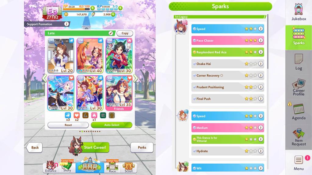 然而,在正式開始你的職業生涯之前,你還必須選擇一對老兵 Umamusume 和一套支持卡。退伍軍人提供初始統計提升(如果達到 3 星或以上,則提供獨特技能),並且可以通過完成職業生涯來獲得。它們還允許您通過 Sparks 獲得新技能和統計/評級增加。