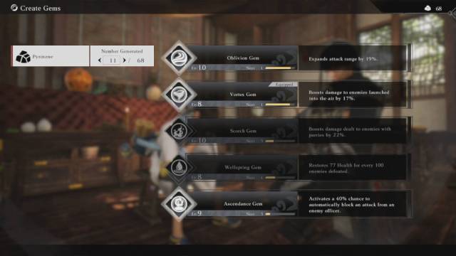 在世界上的任何城鎮,您都可以進入旅館,在那裡您可以閱讀來自 NPC 的消息,幫助建立真三國無雙 起源 紐帶。字母選項下方是創建寶石。這允許您將水晶精煉為五種被動技能之一的等級: